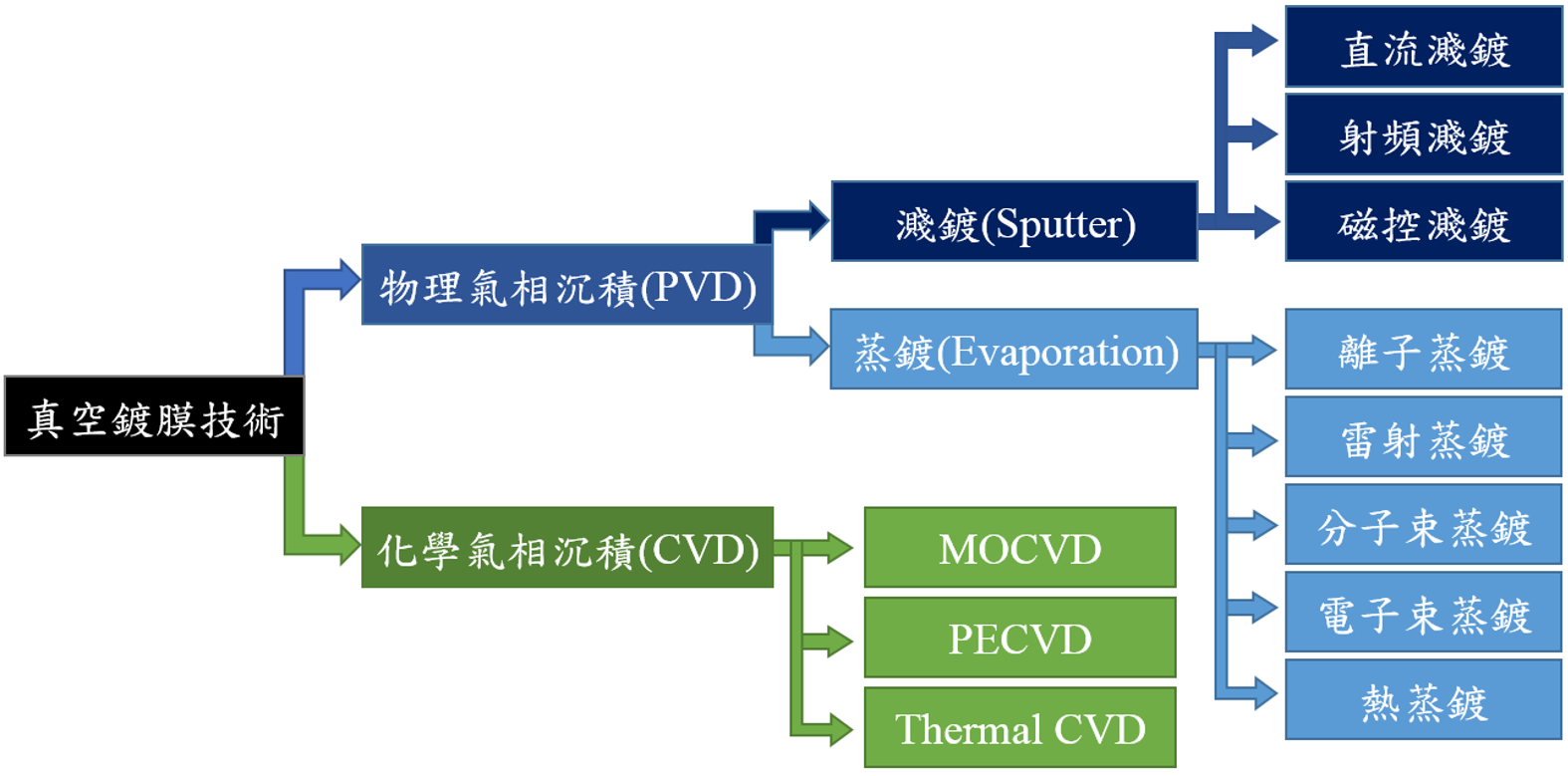 常用鍍膜技術如圖所示,從傳統的電鍍到現今的氣相法,如物理氣相沉積(Physical Vapor Deposition, PVD)及化學氣相沉積(Chemical vapor deposition, CVD)兩種。而隨著工業進步,對於薄膜品質的要求也提高,相較於傳統電鍍法,在真空的環境下可以確保在製程中不會有其他物質摻入薄膜,在現今的高科技技密工業以及半導體產業需要的高品質要求中,真空鍍膜技術是最符合的鍍膜技術,也是高科技工業的關鍵技術。